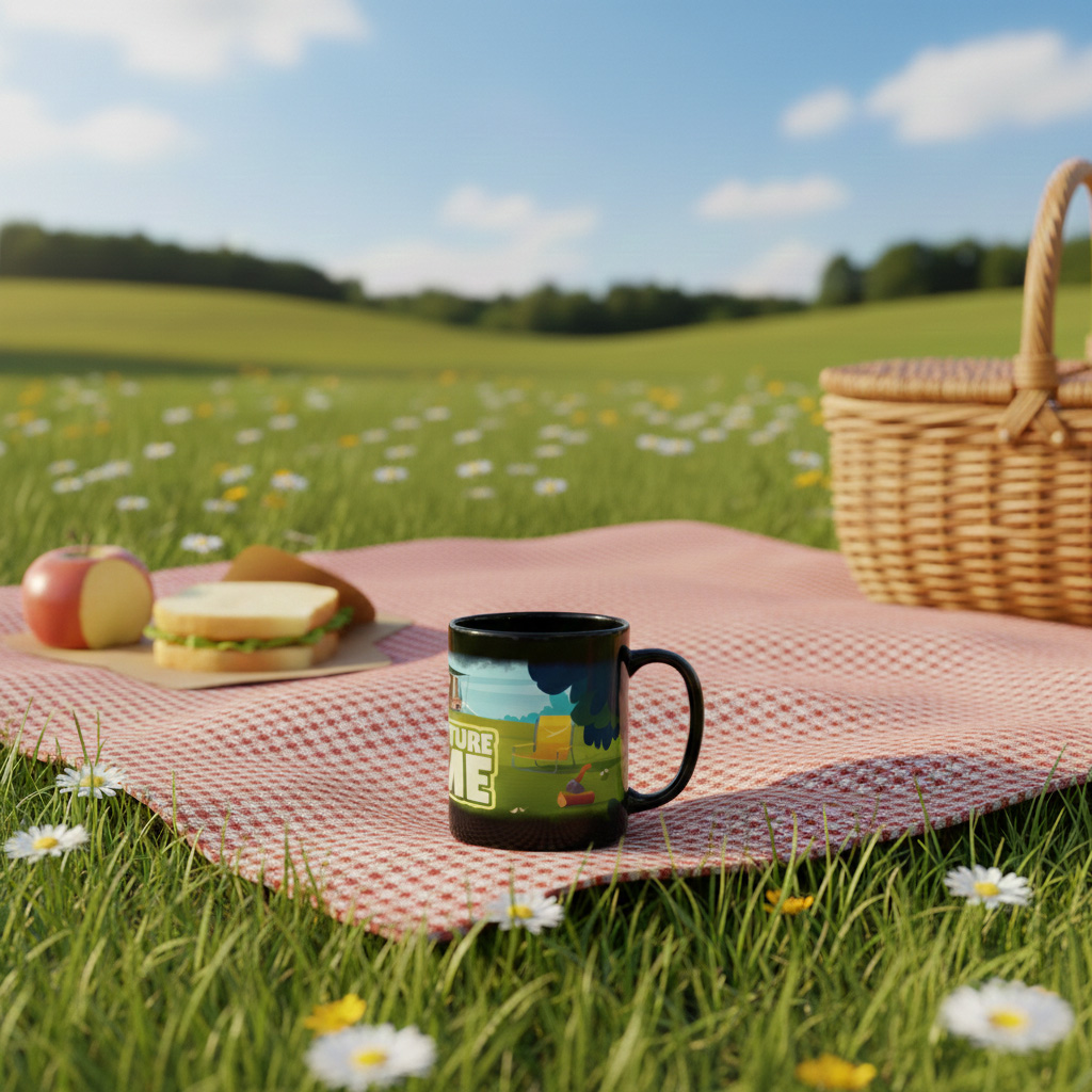 Czarny kubek o tematyce biwakowej kempingowej ADVENTURE TIME Czas przygód
