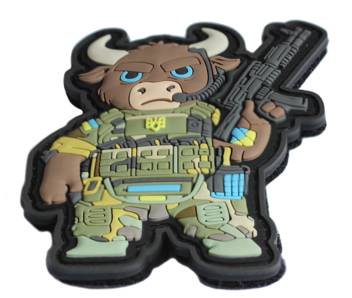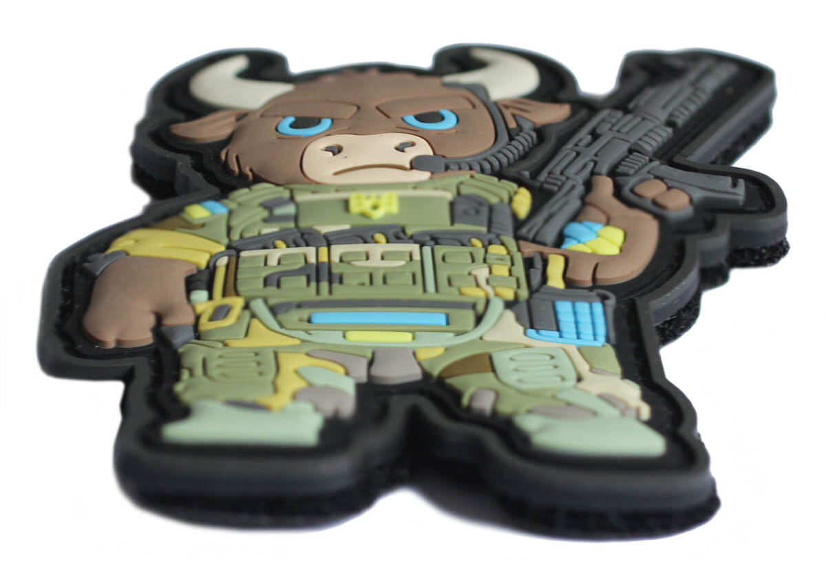 Naszywka morale patch wykonana w technologii PVC 3D, przedstawiająca antropomorficznego żubra-żołnierza w pełnym rynsztunku taktycznym.