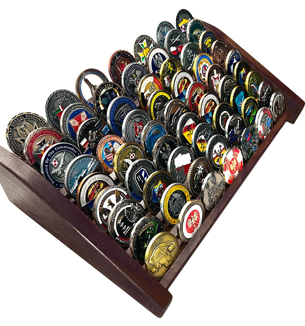 Wbudowane rowki na każdej półce zabezpieczające monety przed przesuwaniem się. Nadaje się do ekspozycji w witrynach, gablotach i na półce kolekcji domowej. Coiny ze zdjęć nie są przeznaczone do sprzedaży i stanowią tylko przykład użytkowania ekspozytora.